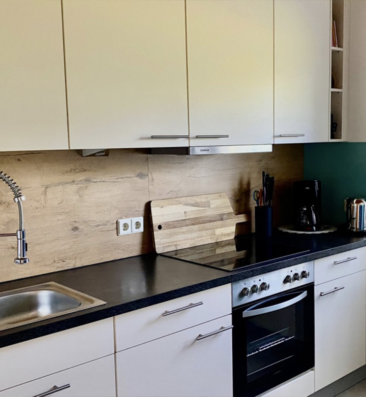 Die moderne Einbauküche ist komplett ausgestattet mit Ceran-Kochfeld, Backofen, Kühlschrank mit Gefrierfach, Geschirrspüler und weiteren Küchenutensilien.